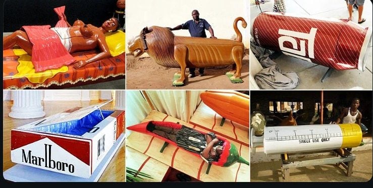Napríklad v Ghane sú známe „fantasy rakvy“ kmeňa Ga, ktoré majú tvar predmetov symbolizujúcich život alebo povolanie zosnulého – od áut a lietadiel až po zvieratá či ovocie. Tieto umelecké diela oslavujú život zosnulého a zabezpečujú jeho štatút vo svete predkov.