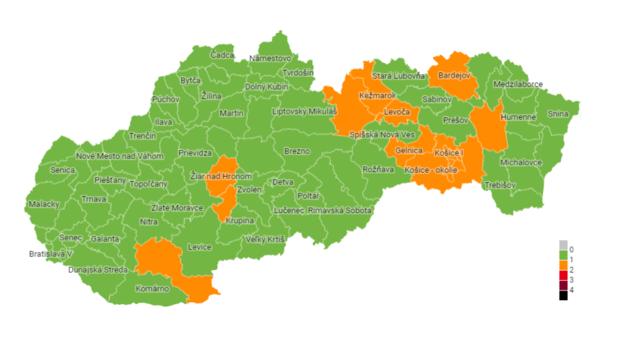 Vo fáze ostražitosti, teda oranžovej farbe, budú okresy Banská Štiavnica, Bardejov, Gelnica, Kežmarok, Košice I.-IV., Košice-okolie, Levoča, Nové Zámky, Poprad, Vranov nad Topľou a Žiar nad Hronom.