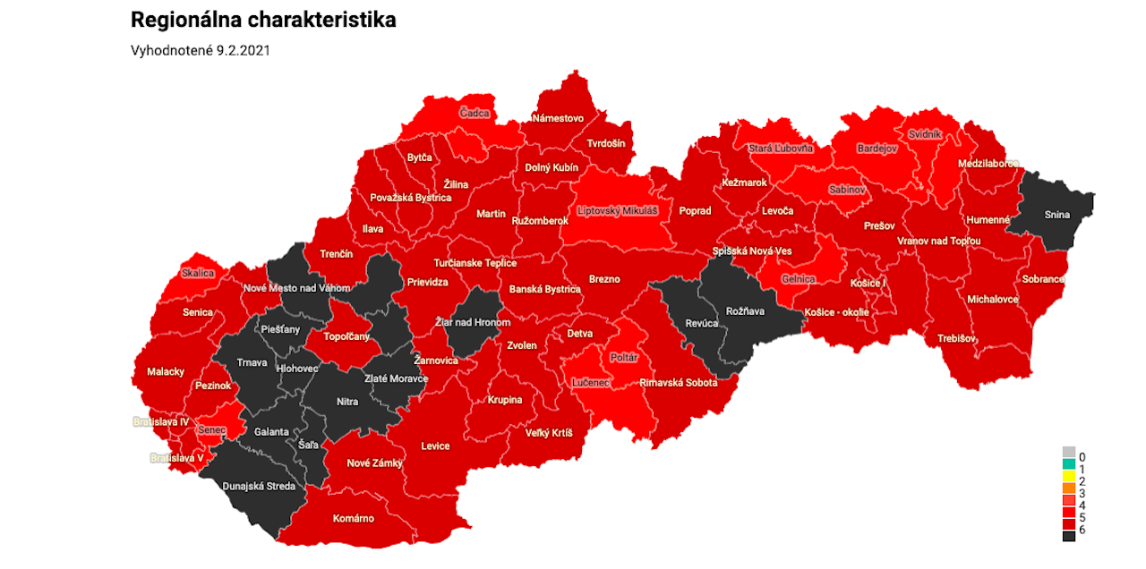 Epidemická situácia na Slovensku je stále vážna, Slovensko je celé v „čiernej“ farbe. Minister zdravotníctva Marek Krajčí na utorkovej tlačovej besede upozornil na to, že situácia sa zhoršila vo väčšine okresov, 15 okresov je v čiernej farbe, 51 v bordovej a 13 v červenej. Ani jeden okres už nie je v bledoružovej farbe. Na Slovensku zároveň stále stúpa počet pacientov v nemocniciach a nedarí sa nám ani zlomiť krivku, čo sa týka úmrtí.