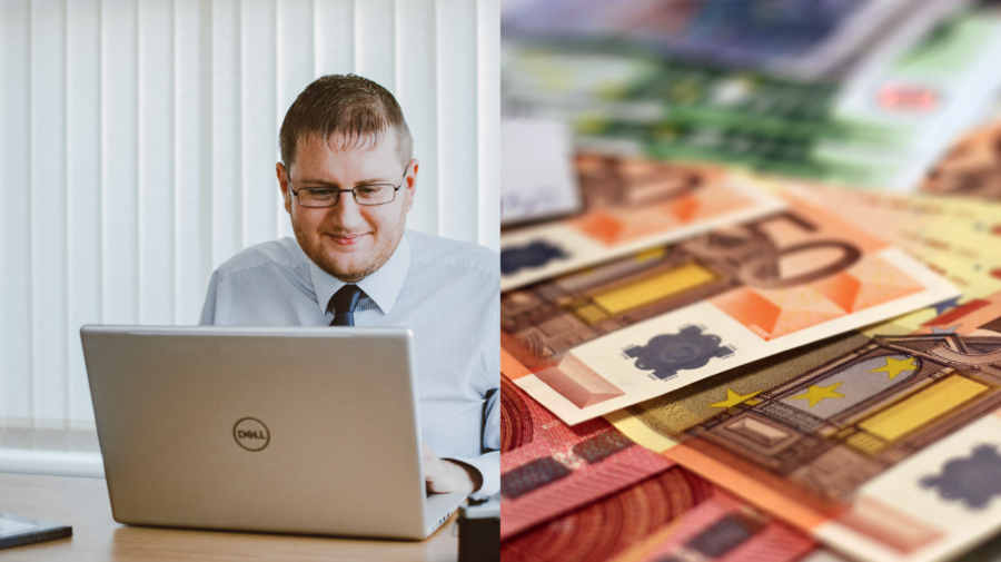 vľavo eurové bankovky, vpravo človek robiaci svoju prácu