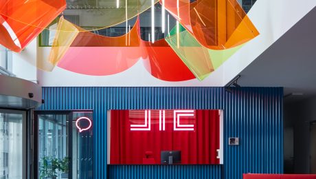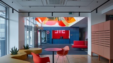 Priestory sú navrhnuté tak, aby prilákali podnikateľov, začínajúce firmy a digitálne podniky. Aj preto je na prízemí umiestnená ikonická inštalácia, ktorá predstavuje identitu JIC a zároveň interaguje s priestorom. Ide o farebné tienidlo z plexiskla, ktoré cez deň vrhá farebné odlesky na okolité povrchy a vizuálne tak prepája prízemie s horným poschodím.