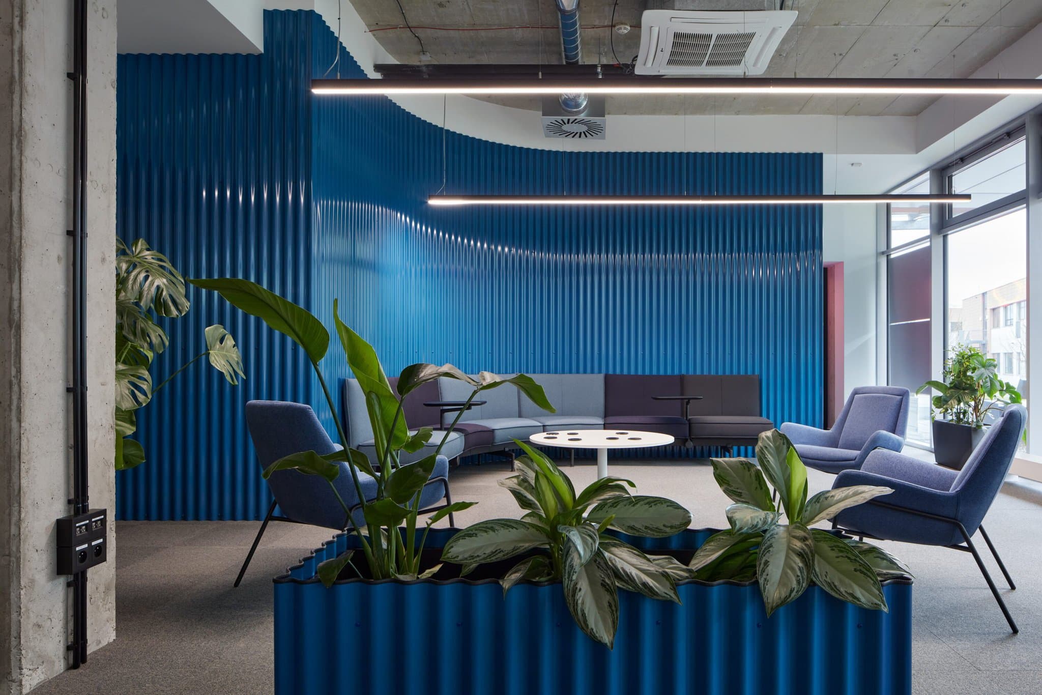 Tiež odvážny farebný systém zónovania informuje o priestoroch pre prácu a stretávanie. Zatiaľ čo modrá zóna je vhodná na pokojnú a samostatnú prácu, červené a oranžové priestory sú určené pre interaktívnejšie využitie.