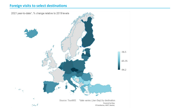 Aj napriek tomu, že sa cestovanie v tomto roku, najmä v lete, v rámci Európy citeľne rozbehlo, stále sa len stavia na nohy. V polovici tohto roka dáta hovorili, že v Európe cestuje o 77 % menej medzinárodných turistov, než v roku 2019.