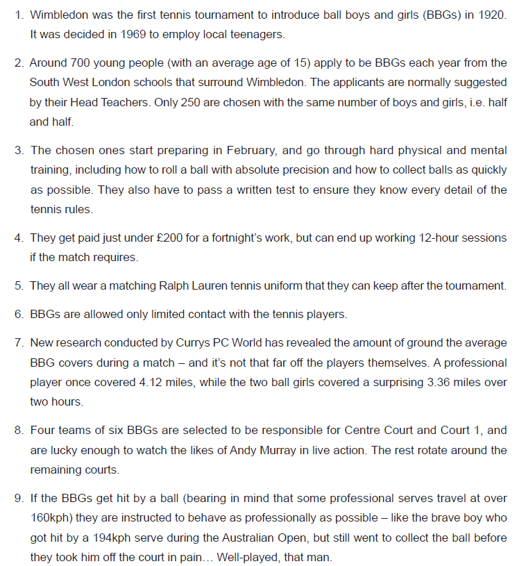 Prečítajte si text vo fotografii. Za textom nasledujú vety, v ktorých chýbajú slová. Vety nie sú v tom poradí, v akom sú usporiadané informácie v texte. Doplň jedno alebo dve slová. Tieto slová sa nachádzajú v texte. Môžu byť aj v inom slovnom druhu a tvare. BBGs’ ......... of the tennis rules is tested in written form.
