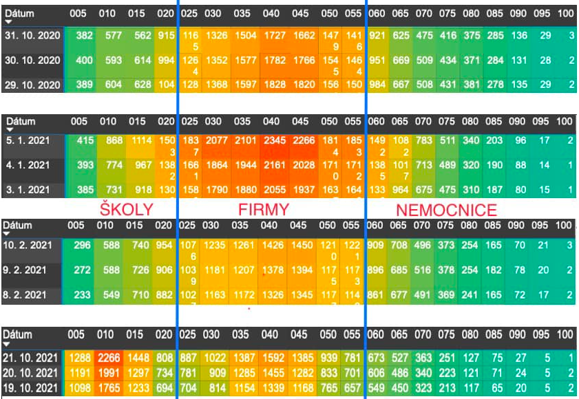 Ako uvádzajú už v úvode, na Slovensku máme niekoľko pandémii. „Jednu v školách s rýchlym rastom a s vysokými číslami pozitívnych (1 % z nich ide do nemocníc). Druhú vo firmách s mierne nižšími číslami pozitívnych, ale s vysokým rastom (rodičia detí). Tretiu v nemocniciach kvôli seniorom nad 60 rokov (predstavujú 90 % príjmov do nemocníc) s nízkymi číslami pozitívnych a s relatívne stabilným, ale nižším rastom. Pritom 25 % – 30 % z infikovaných nad 75 rokov ide do nemocníc.“