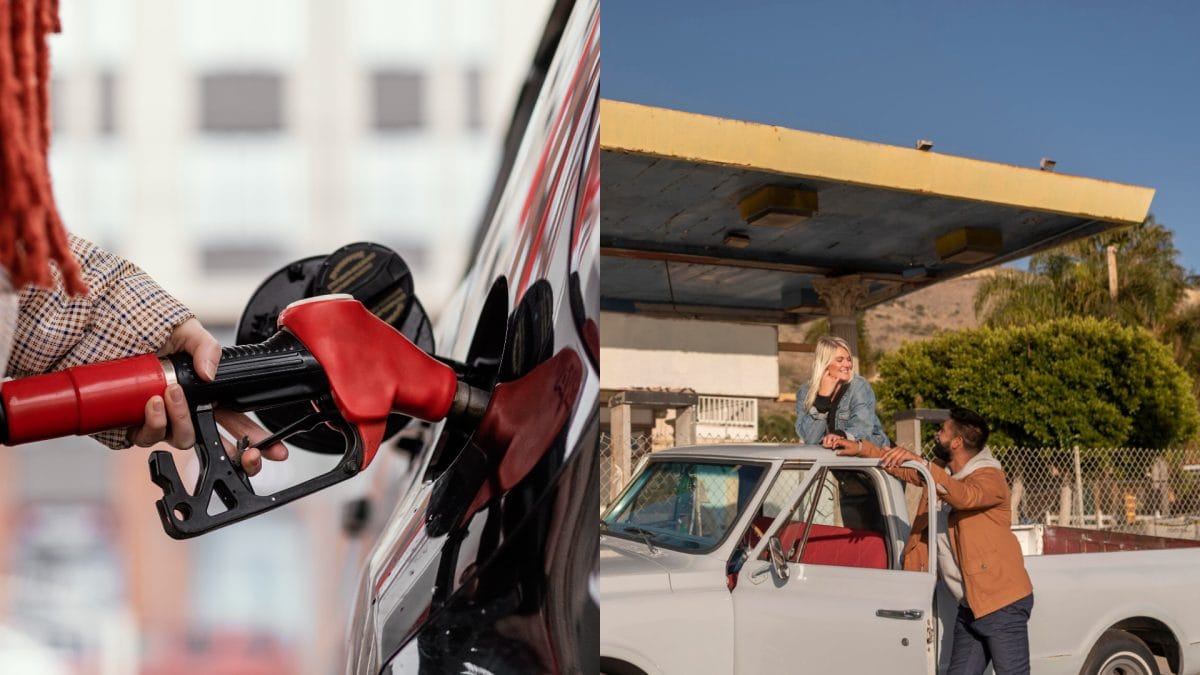 Na snímke ženská ruka, ktorá tankuje a pár, ktorý je na benzínke.
