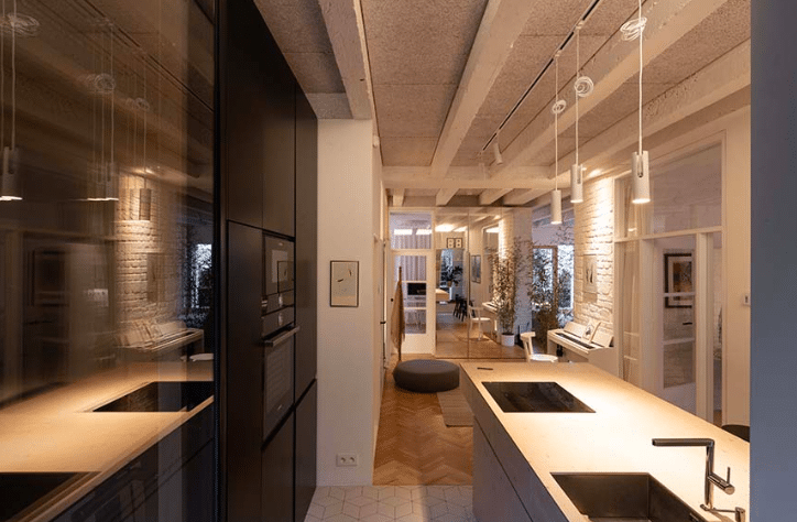 O realizáciu rekonštrukcie sa starali architekti Tomáš Krištek, Laura Pastoreková a Ondrej Kurek. Architekti stáli pred neľahkou úlohou, no zvládli ju doslova bravúrne. Vďaka otvoreniu viacerých priestorov vznikol z bytu akýsi rodinný dom. V byte tak nie je priestor, kde by bola striktne oddelená nočná a denná zóna. Tento priestor v sebe spája rodinné bývanie so životom v mestskom centre.