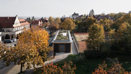 Zaujímavým momentom stavby je aj fakt, že horná časť pavilónu zakrýva existujúcu trafostanicu – pôsobí ako súčasť architektúry a nenarúša vizuálnu čistotu celku. Vďaka vsadenosti do terénu pôsobí pavilón opticky menší, čo pomáha začleniť ho do kontextu zástavby a parku.
