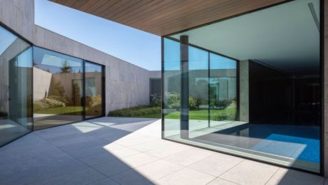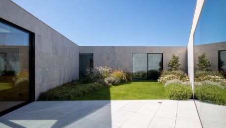 Jedinečné riešenie terénu umožnilo architektom vytvoriť vnútorné nádvorie s trojuholníkovým pôdorysom, ktoré je srdcom domu. Toto nádvorie obklopuje záhrada s bazénom a poskytuje pokojné prostredie pre oddych. Z izieb orientovaných smerom k tomuto vnútornému priestoru majú obyvatelia súkromné výhľady na zeleň, zatiaľ čo z opačnej strany môžu obdivovať malebné jazero.