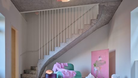 Pôvodné kľukaté schodisko predstavuje centrálny vizuálny prvok spoločných priestorov. Jeho kamenné stupne prešli len miernym ošetrením – boli vykartáčované a natreté ochrannou vrstvou, aby si uchovali svoju autentickú patinu. Hrubá textúra stupňov vytvára zaujímavý kontrast k hladkým stenám chodieb a výrazným farbám vstupných dverí bytov.