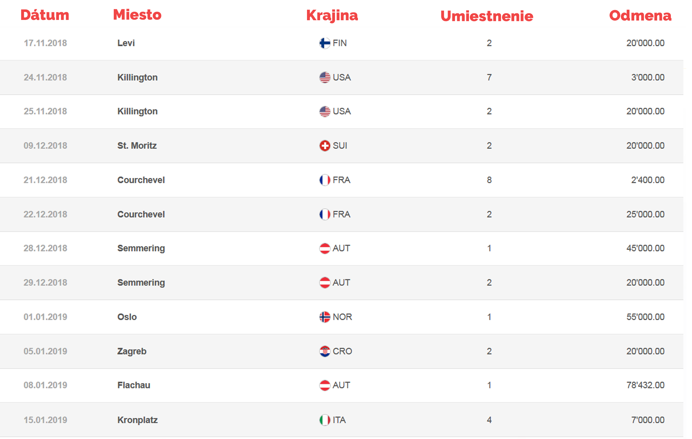 Petra je síce ešte len v polovici sezóny, no už dnes je isté, že si zarobila viac než počas celej tej minuloročnej (175-tisíc eur). Podľa oficiálnych informácií Medzinárodnej lyžiarskej federácie je to v prepočte už viac než 280 000 eur. Najviac si odniesla za prvé miesto v pôsobivom výkone v slalome vo Flachau, a to približne 70 000 eur. Pozri si prehľad jej odmien za túto sezónu v nasledujúcej tabuľke. (odmena je vyjadrená v švajčiarskych frankoch; 1CHF = 0,88 EUR)