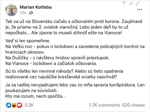 Hoaxeri vidia v očkovaní hrozbu, a nie záchranu pred vírusom. Patrí medzi nich aj šéf ĽSNS Marian Kotleba, ktorý je presvedčený, že pandémia je len zámienkou na zrušenie kresťanských sviatkov.