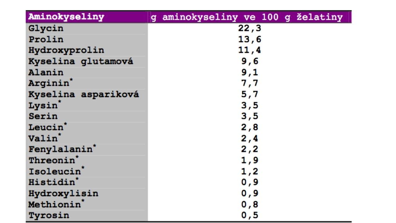 V skratke je želatína kolagén vytvorený z čiastočne hydrolizovaných zvieracích ostatkov. Okrem toho, že nemá zápach, farbu, ani chuť, je to ľahko stráviteľná bielkovina zložená z 18 aminokyselín. Tie sú zreťazené stavebnými látkami pre rôzne druhy proteínov. Ľudský organizmus si dokáže z proteínov vytvoriť množstvo aminokyselín potrebných pre život, pričom počet najdôležitejších aminokyselín je 10 a s výnimkou tryptophanu obsahuje želatína všetky.
