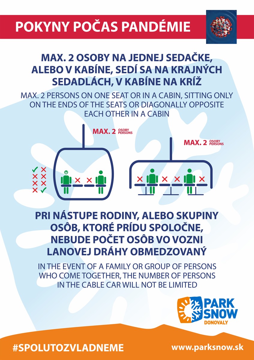 V koridoroch pred turniketmi je nutné dodržiavať rozostupy dva metre, samozrejmosťou má byť aj prekrytá tvár a prísna hygiena rúk. Cena 7-hodinového lístka pre dospelú osobu zakúpiš online za 22,40eur, na mieste v stredisku je to 32 eur.