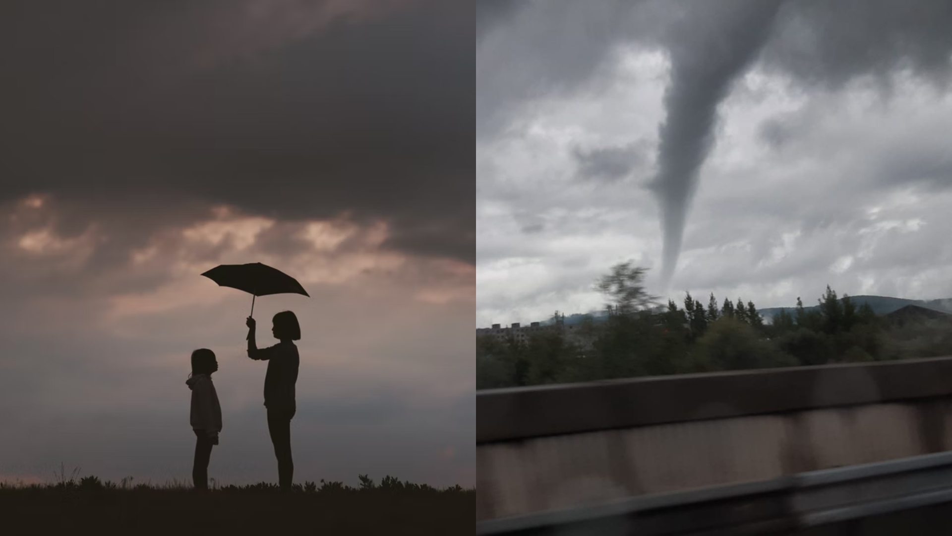 Na snímke je žena a dieťa poddáždnikom a tornádo.