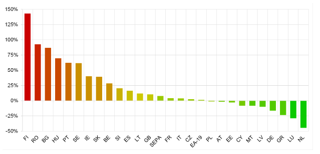 Domáce transakcie tvorili 90% zo všetkých transakcií dokopy – z toho na 35% z nich zaútočili podvodníci. Cezhraničné transakcie v rámci SEPA tvorili 8% všetkých transakcií – ale až 43% z nich zneužili zlodeji. Z 2% všetkých transakcií, ktoré sa uskutočnili mimo SEPA, bolo zneužitých 22%.