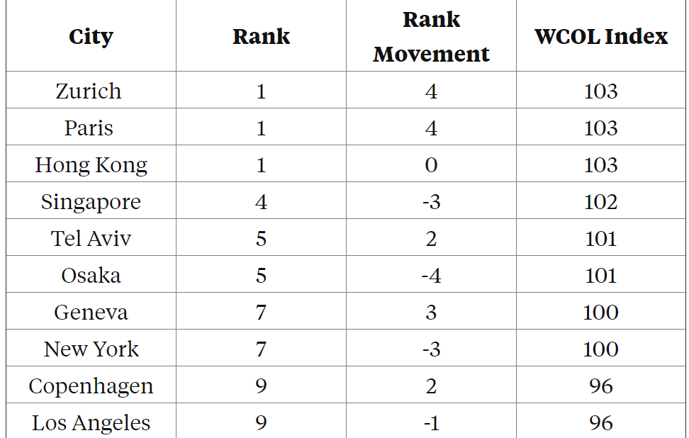 Štyri z desiatich miest sa nachádzajú v Európe. Prekvapivá je však prvá priečka, ktorú obsadil Paríž s Zürichom. Podľa Dutt sa tieto miesta na vedenie dostali kvôli prudkému nárastu cien nájmu a aj lekárskych prehliadok. V správe sa uvádza aj fakt, že kvôli koronavírusu boli viaceré vlády nútené zvýšiť dane.