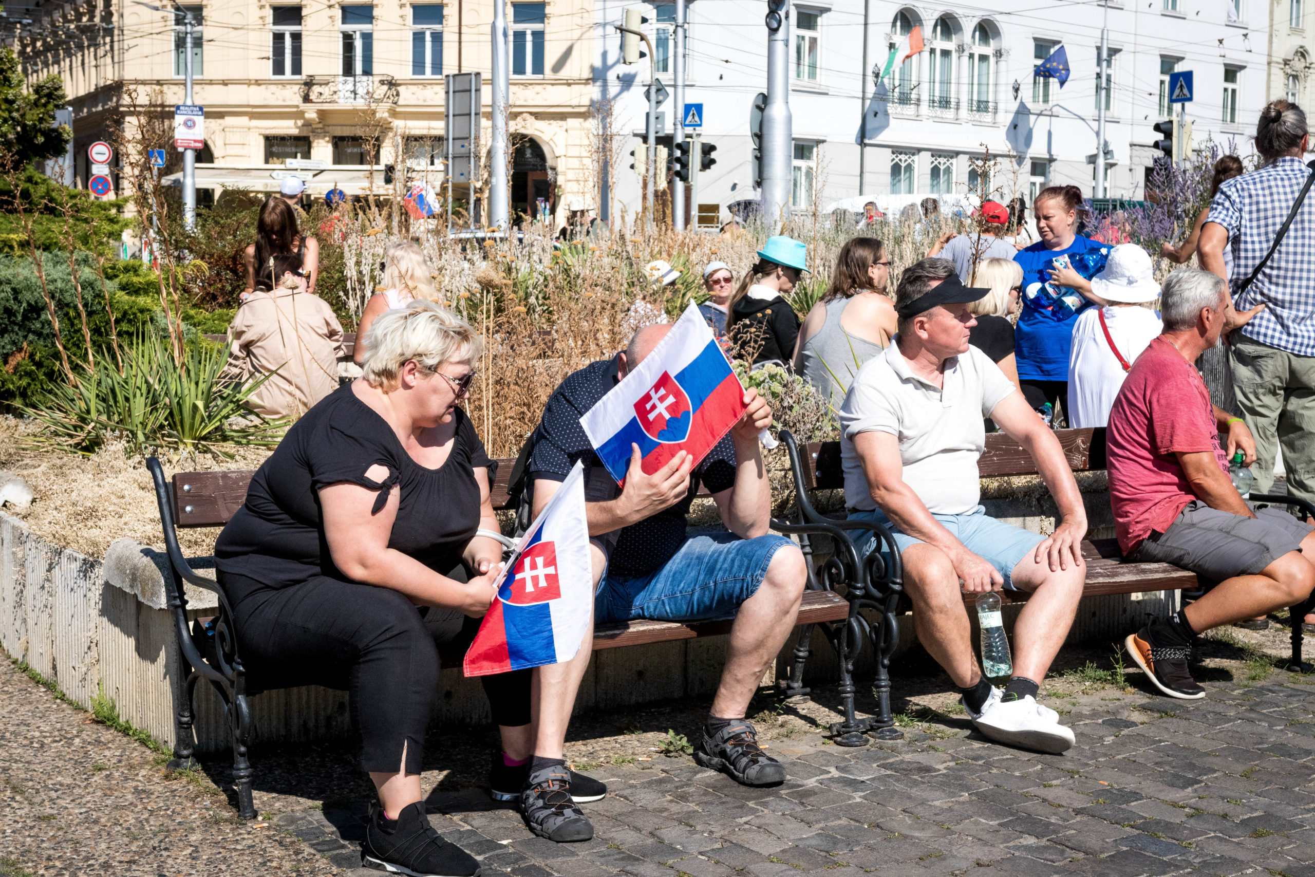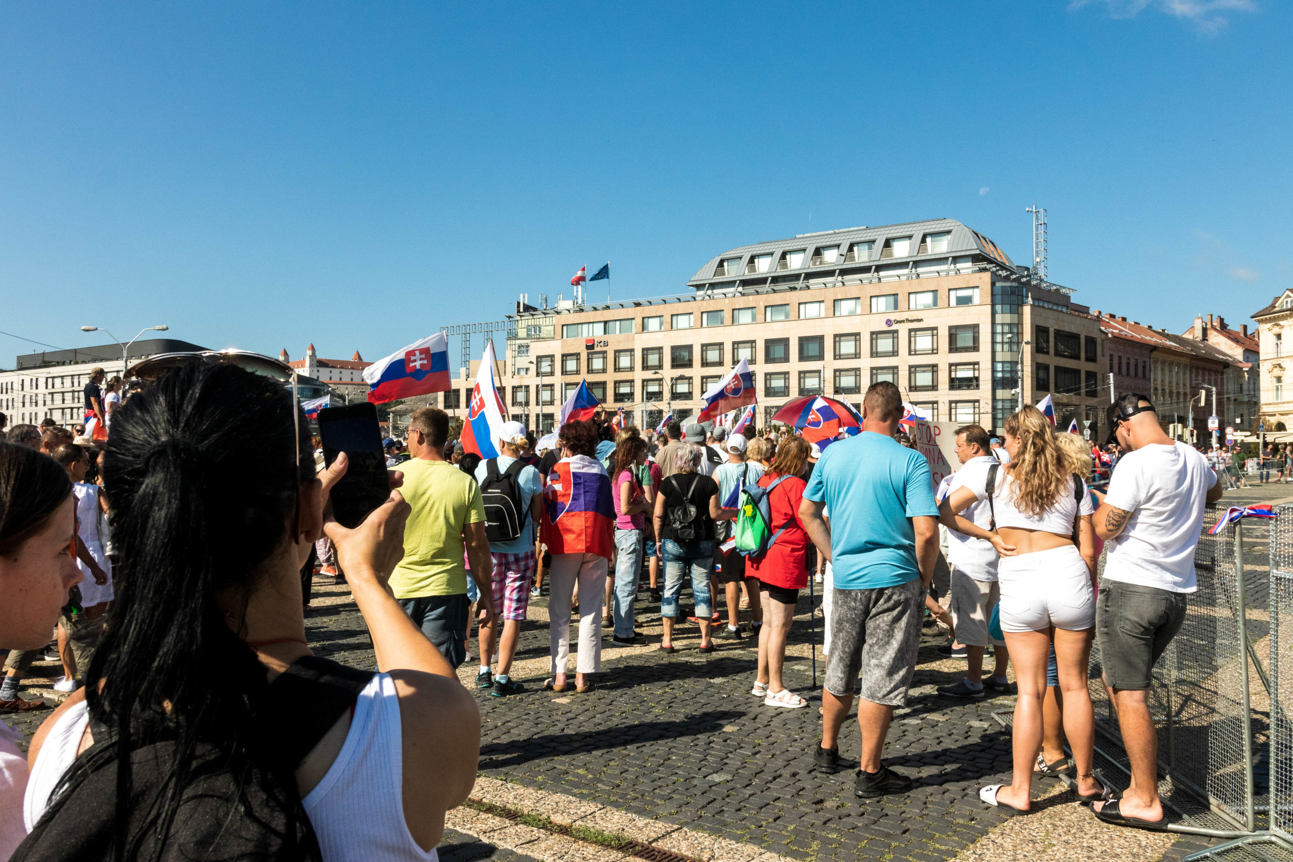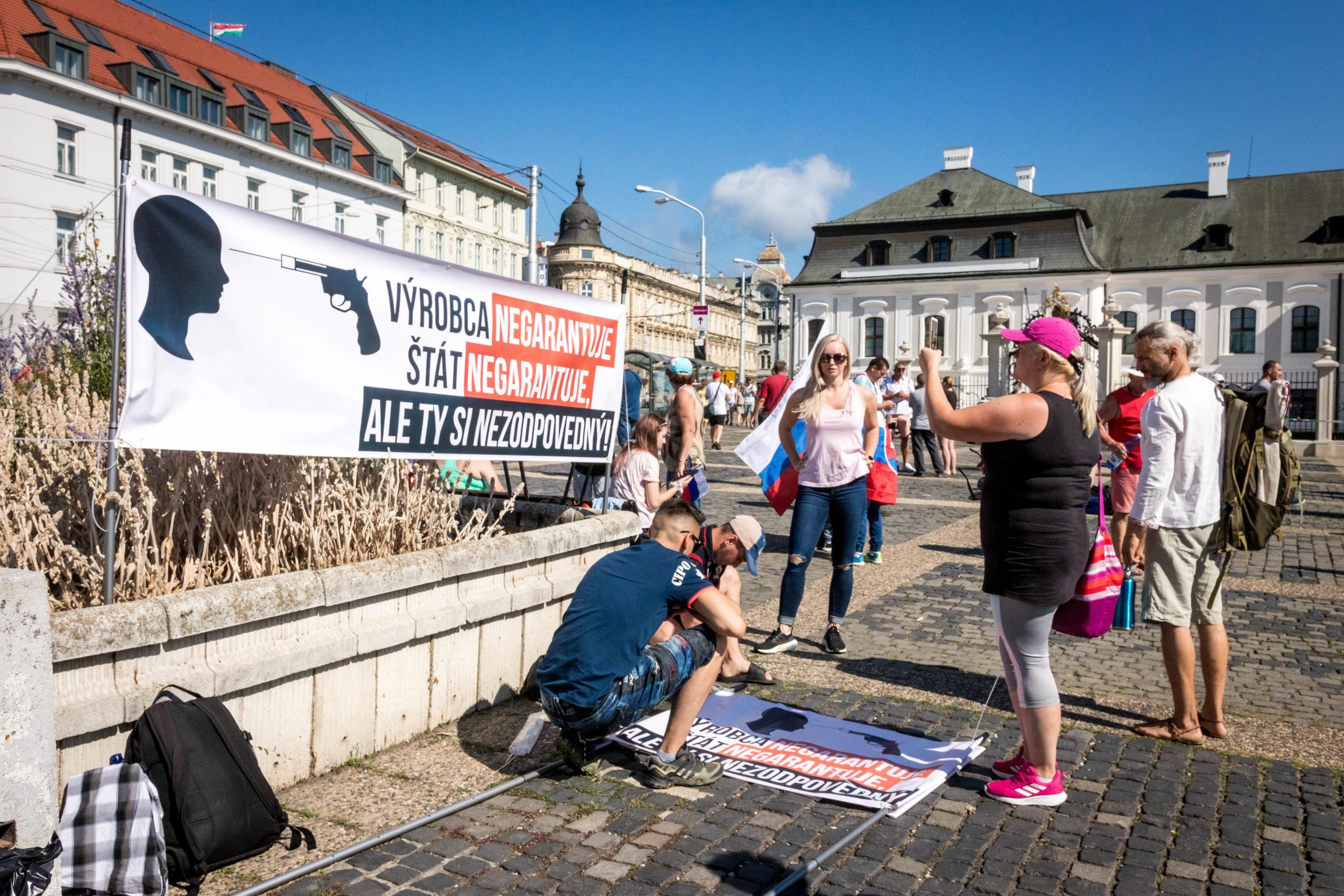 „Rúška dole, hlavy hore,“ ozývalo sa opakovane z námestia v centre Bratislavy. Niektorí demonštranti držia v rukách štátne vlajky či transparenty s nápismi „vakcína je vražda“ či „apartheid“. Odmietajú novelu, podľa ktorej by sa malo pri tvorbe opatrení prihliadať na digitálny COVID preukaz.