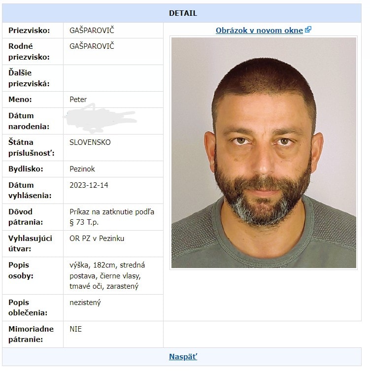 V pátracom systéme polície už teraz svieti fotografia bývalého šéfa kontrarozviedky odsúdeného za nepriamu korupciu. Objavila sa v ňom vo štvrtok podvečer. V systéme je okrem jeho fotografie, mena a priezviska aj dátum vyhlásenia pátrania a popis osoby. V ňom je napísané, že Peter Gašparovič je 182 cm vysoký, strednej postavy, má čierne vlasy, tmavé oči a je zarastený.