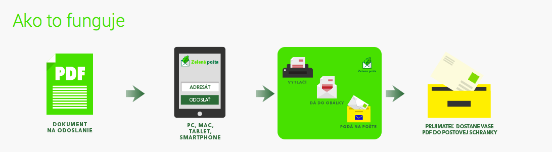 Zelená pošta je aplikácia (desktop a mobilná appka), prostredníctvom ktorej môžete posielať vašu každodennú poštu elektronicky. Ak máte teda list, faktúru, úradné listiny alebo iné dokumenty, ktoré by ste museli klasicky posielať poštou, viete ich teraz poslať pohodlne – elektronicky. Všetko čo preto musíte spraviť, je vytvoriť si konto na stránke Zelenej pošty, nahrať súbor, napísať adresu a rovno posielate. A najlepšie na tom celom je, že je to naozaj také jednoduché.