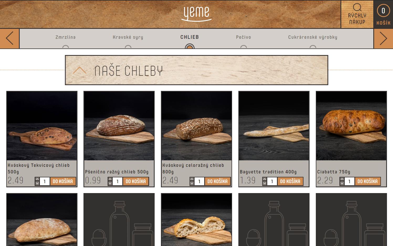 V Yeme sa snažíme zákazníkov previesť celým sortimentom tak, ako je to aj v kamennom obchode. Ak si tu prvýkrát, môžeš si pozrieť takzvaného Sprievodcu nákupom. Ak vieš presne, čo chceš, môžeš využiť aj sekciu Rýchly nákup, kde sa dajú položky vyhľadať podľa názvu.