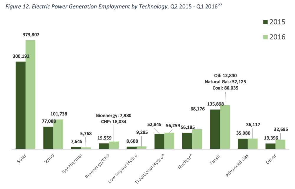 Zistilo sa, že solárny sektor zamestnal 347 000 ľudí v rokoch 2015 a 2016. To je celých 43% v energetickom sektore, zatiaľ čo fosílne palivá spolu zamestnávali iba 187 117 ľudí (22%).