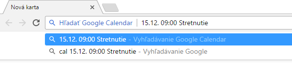 Teraz môžeš pridať novú udalosť cez adresný riadok, vpíš napríklad “cal 15.12. 09:00 stretnutie” a stlačte Enter (nedaj sa zmýliť, Chrome ti ponúkne “vyhľadávanie Google Calendar”, to je v poriadku) a budeš presmerovaný do Google Kalendára, s predvyplneným dátumom a názvom udalosti.