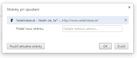 Ak pri používaní Chrome navštevuješ vždy pri prihlásení tie isté stránky (správy, e-mail a Facebook), môžeš si nastaviť, aby ich Chrome vždy otvoril pri spustení. Stačí v nastavení, v časti “Pri spustení” vybrať “Otvoriť konkrétnu stránku” (alebo jednoducho do adresného riadka napísať chrome://settings/startup). Môžeš si vybrať posledné stránky z histórie alebo jedným tlačítkom vybrať všetky záložky, ktoré máš aktuálne otvorené.