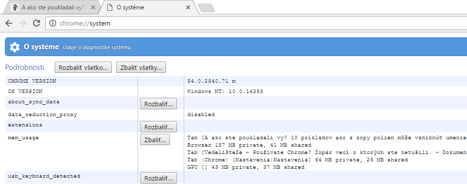 chrome://system – informácie o systéme, vrátane použitej pamäte
