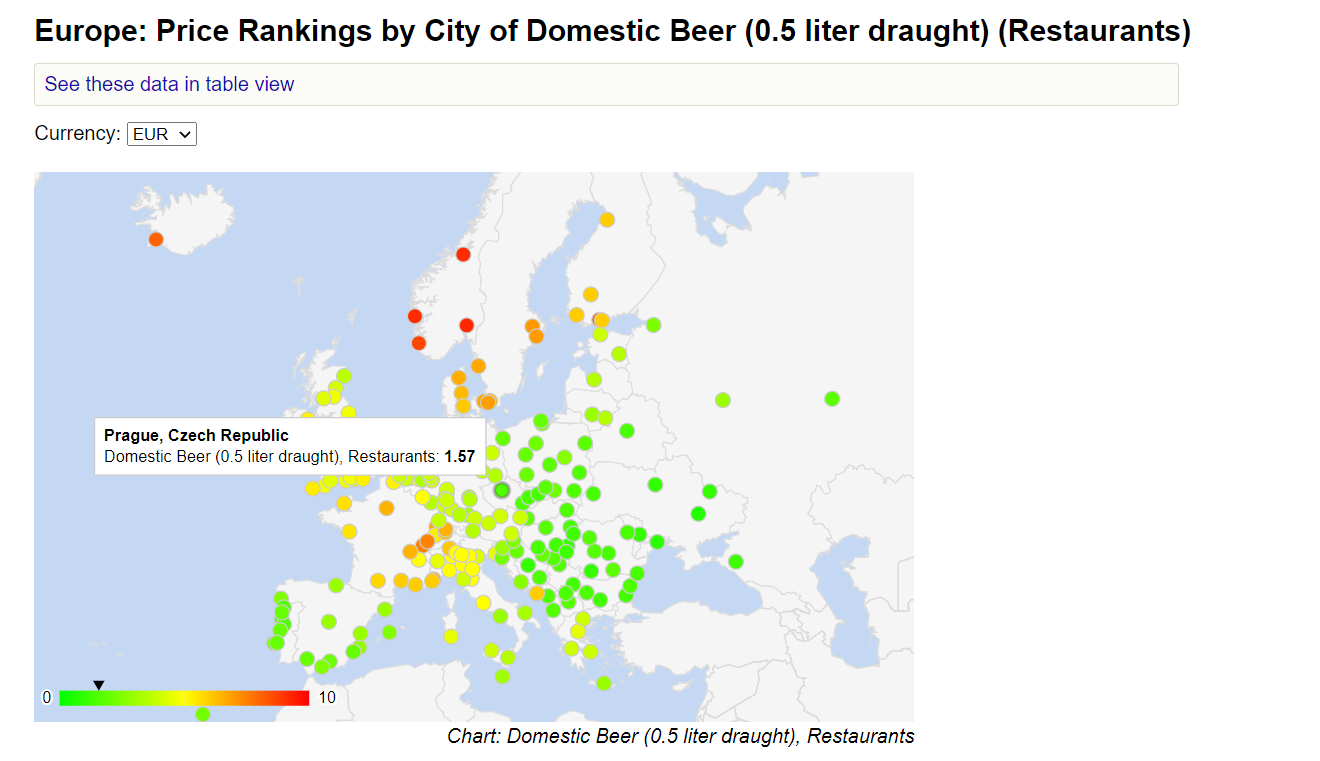 Z európskych metropol, do ktorých prúdia davy turistov, je Praha najlacnejšie mesto, ak ide o ceny alkoholu. Podľa portálu Numbeo, stojí polliter čapovaného piva v českom hlavnom meste 1,57 eur.