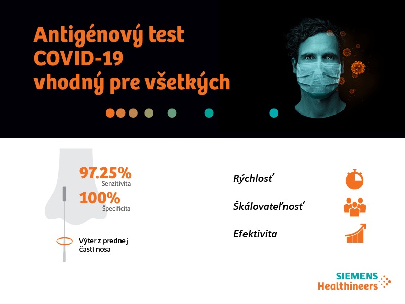 Sporom o parametre antigénových testov na COVID-19 môže byť koniec. Krajine sa otvárajú nové možnosti v podobe najkvalitnejších antigénových testov na trhu od spoločnosti Siemens Healthineers. Nový CLINITEST Rapid COVID-19 Antigen Test má na rozdiel od dosiaľ používaných špecificitu až 100% a parameter senzitivity dosahuje 97,25%. Výhodou je aj omnoho vyšší komfort pri odbere vzorky. Pre vykonanie testu totiž postačuje len ster z prednej časti nosa, nie z nosohltanu, ako je tomu teraz.