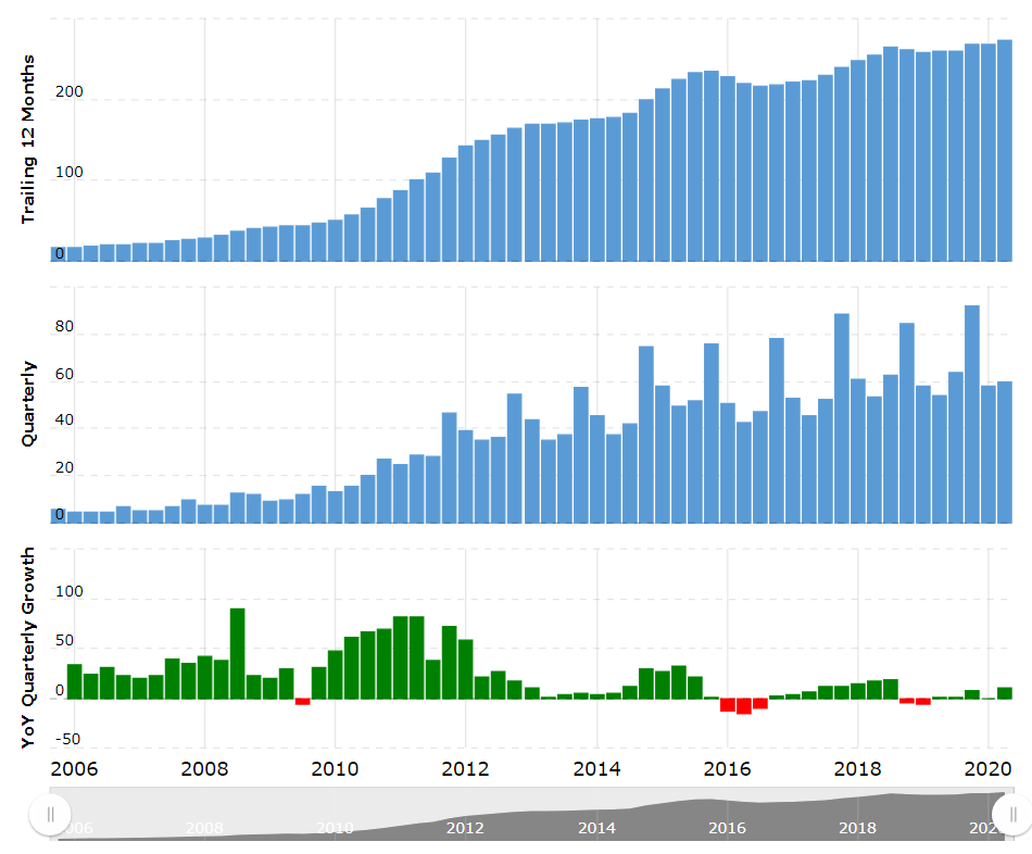 Obraty spoločnosti Apple od 2006 do 2020 podľa macrotrends:
