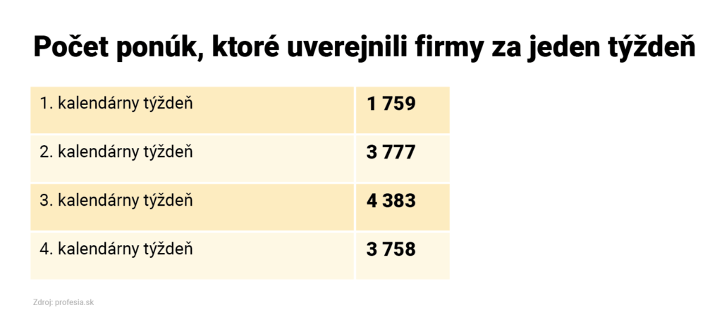 Po skončení vianočných a novoročných sviatkov sa trh práce prebudil a prináša opäť pozitívnejšie čísla. Ako ďalej ukazuje analýza najväčšieho pracovného portálu na Slovensku Profesia.sk, počas tretieho kalendárneho týždňa uverejnili zamestnávatelia 4 383 pracovných ponúk. Týždenný počet inzerátov nad 4-tisíc pritom portál zaznamenal naposledy ešte v októbri.