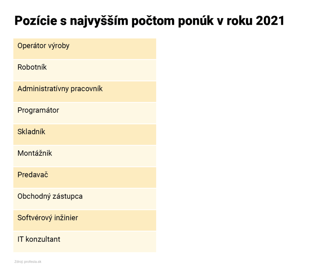 Uchádzači majú počas prvých týždňov roka 2021 najčastejšie k dispozícii ponuky práce na operátorov výroby, robotníkov, administratívnych pracovníkov či programátorov. Zamestnávatelia požadujú od uchádzačov aktuálne najmä stredoškolské vzdelanie. Vyše 40 % ponúk hľadá kandidátov s maturitou, ďalších 20 % požaduje stredoškolské vzdelanie bez maturity.