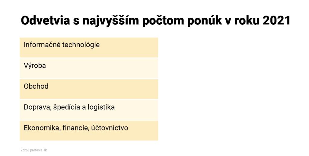 Stále silnejšie postavenie na slovenskom trhu práce má oblasť informačných technológií. Kým v roku 2018 tvorili pracovné inzeráty v IT 10,5 % z celkovej ponuky Profesie, v roku 2020 stúpol tento podiel na 12,4 %. „Začiatok nového roka tento trend zatiaľ potvrdzuje a informačné technológie sú aktuálne sektorom s najvyšším počtom pracovných ponúk. V období od 1. do 24. januára tvorilo IT takmer 18 % z celej ponuky,“ konštatuje portál.