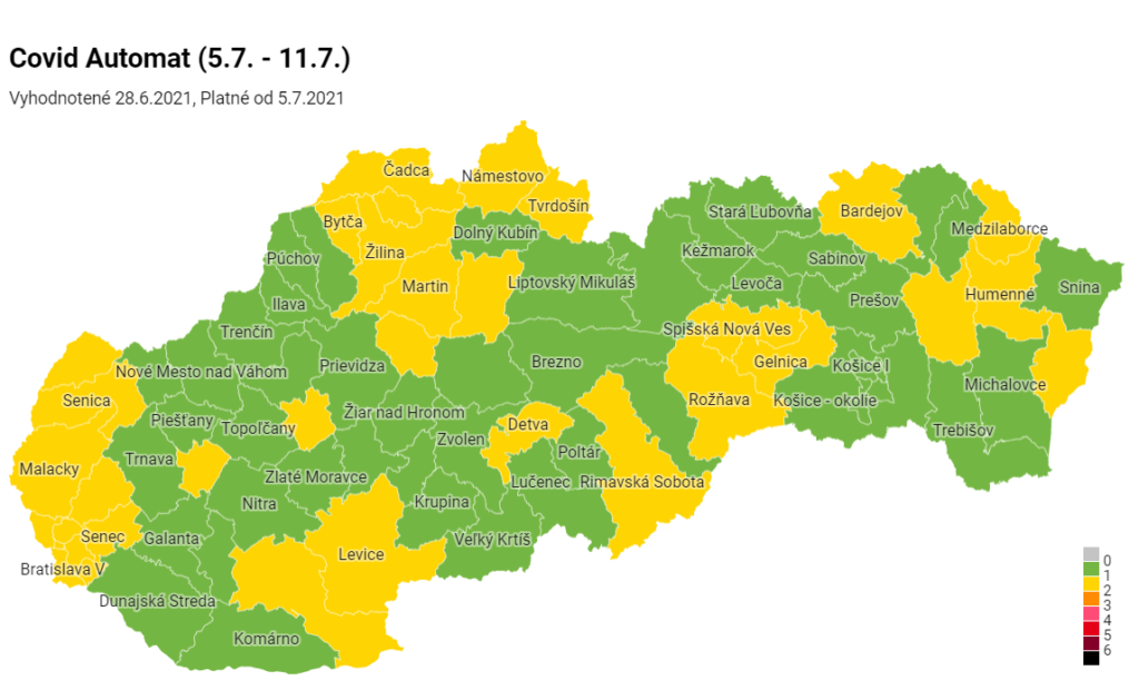 Od pondelka máme v COVID automate už len žlté a zelené okresy. Nové rozdelenie okresov schválila v stredu vláda. Od 5. júla bude v žltej farbe 33 okresov, do zelenej farby bude patriť 46 okresov Slovenska.