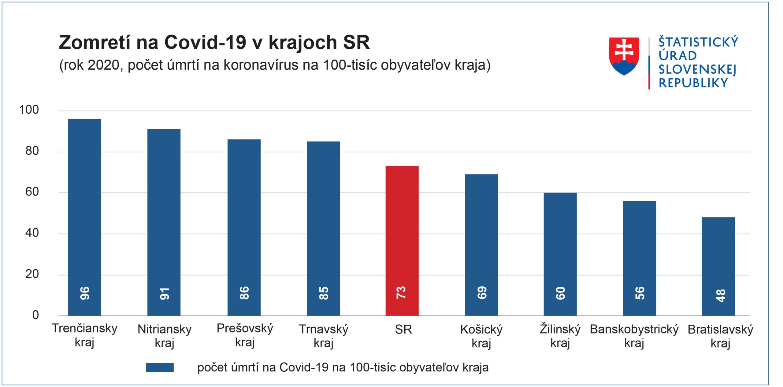 Súčasne platí, že COVID-19 z tohto celku spôsobil 73 úmrtí na 100-tisíc obyvateľov. Situácia sa však odlišovala podľa regiónov. Najvyššiu mieru úmrtnosti mal Trenčiansky kraj s hodnotou 96 zomretých na COVID-19 na 100-tisíc obyvateľov a Nitriansky kraj s hodnotou 91 zomretých na 100-tisíc obyvateľov.