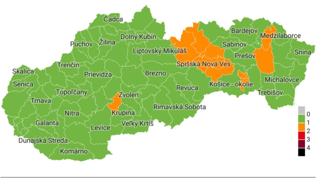Do oranžovej farby sa od 23. augusta zaraďujú okresy Banská Štiavnica, Gelnica, Kežmarok, Košice I. – IV., Levoča, Poprad, Spišská Nová Ves, Stropkov a Vranov nad Topľou.