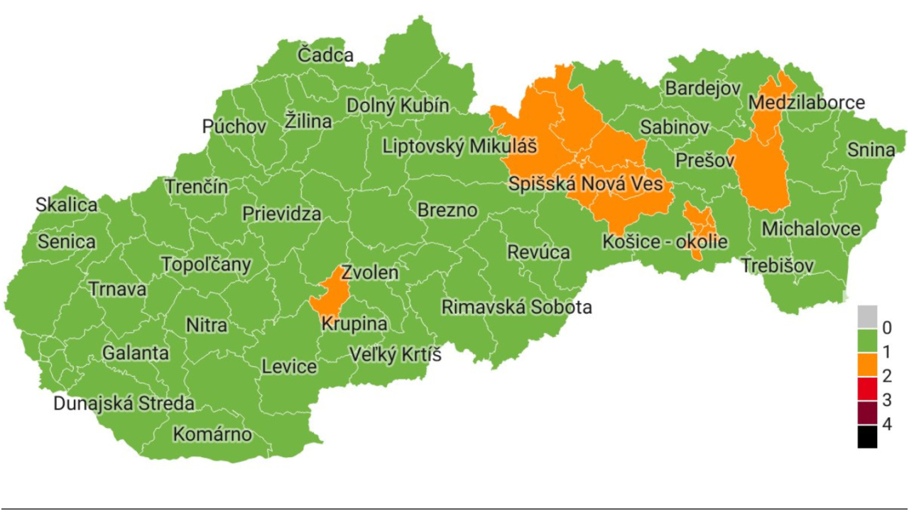 - Až 12 okresov je v oranžovom stupni ostražitosti