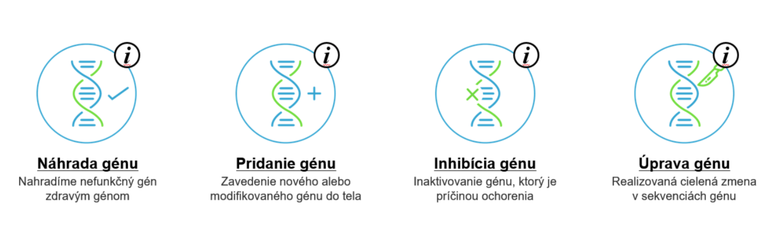Existujú štyri prístupy v génovej terapii – môžeme pridať gén, ak chýba, inhibovať gén, vymeniť alebo upraviť podľa potreby.