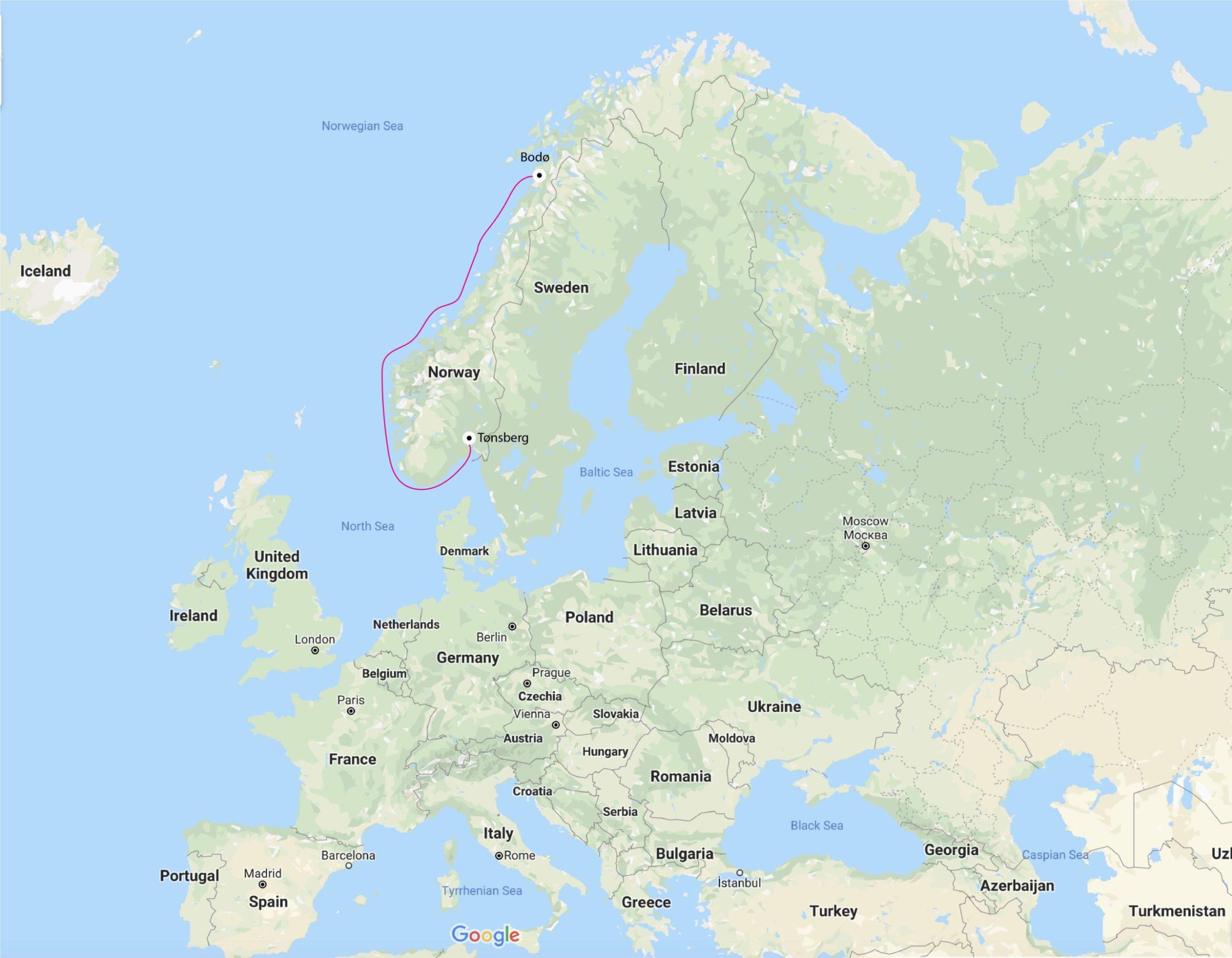Plánovaná plavba zahŕňala úsek z juhovýchodu Nórska, z Oslo fjord, pozdĺž celého, východného a južného pobrežia na západné pobrežie a smerom nahor až za polárny kruh. (viď obrázok)