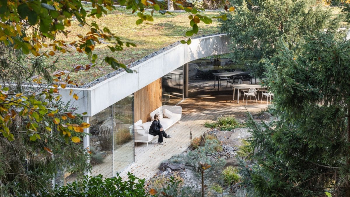 Architekti sa vedome vyhli lesklým povrchom a efektným gestám. Naopak – vybrali surové, pravdivé materiály, ktoré časom starnú dôstojne a prirodzene. Pohľadový betón s odtlačkom debnenia, gabiónové múry plnené drveným kameňom, teplé drevo a subtílne oceľové detaily. Tieto prvky sa opakujú v exteriéri aj interiéri, čím sa ešte viac stiera hranica medzi vnútrom a vonkajškom.