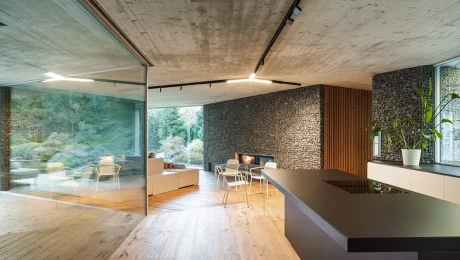 Vnútorné steny a stropy z pohľadového betónu dopĺňajú drevené akcenty, ktoré vnášajú teplo a mäkkosť. Vizuálnu čistotu priestoru podporuje aj zabudovaný nábytok a skryté dvere. Výsledkom je prostredie, ktoré nepôsobí stroho, ale pokojne a vyvážene – ako samotná príroda.