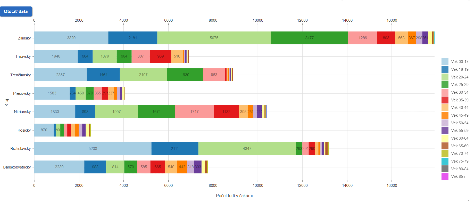 Najviac pozitívne testovaných RT-PCR testami bolo v Košickom kraji (37), nasleduje Žilinský (23), Prešovský (16), Bratislavský (12), Trnavský (10), Banskobystrický (9), Trenčiansky (7) a Nitriansky (2).
