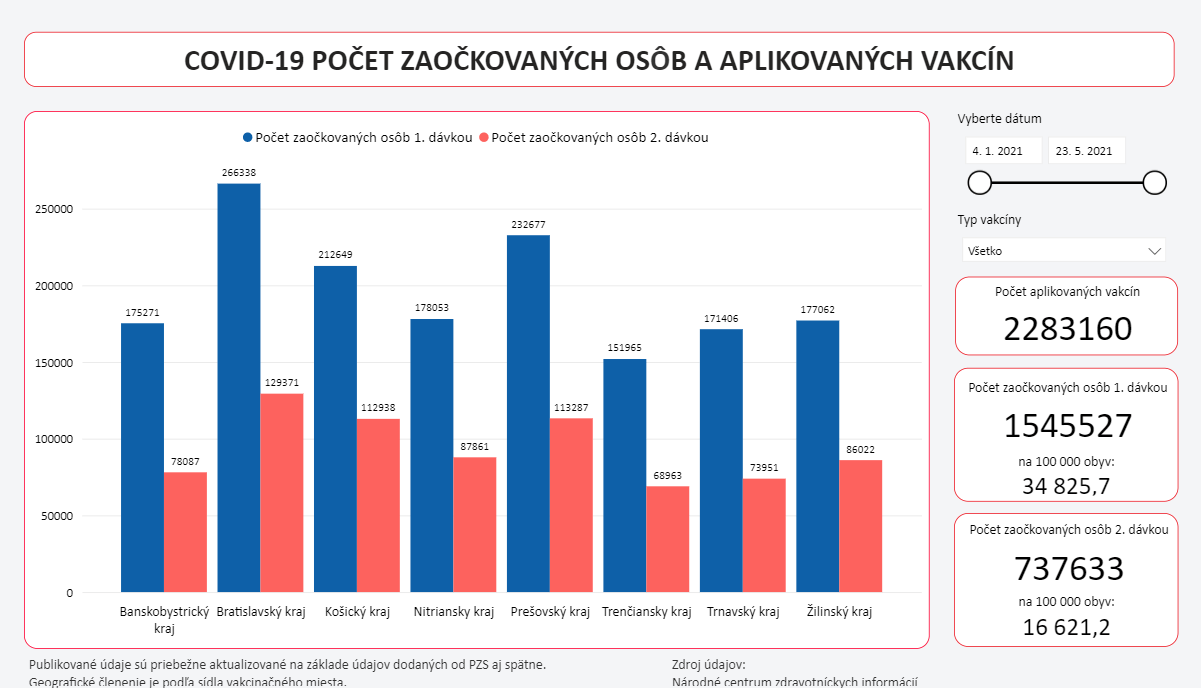 Celkový počet zaočkovaných osôb prvou dávkou vakcíny je 1 565 421 za predchádzajúci deň pribudlo 14 765 zaočkovaných. Druhú dávku vakcíny už dostalo 750 480 ľudí, uplynulý deň sa zaočkovalo 7 648 ľudí. Informuje MZSR.