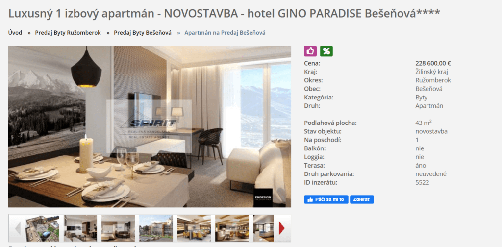 Za podobnú cenu ponúka spoločnosť RK Spirit apartmán v hotely Ovruč na Štrbskom Plese. Za 65 m2 dá kupujúci 261 252,00 eur, takže cena m2 je 4 019 eur. Tá istá spoločnosť predáva aj apartmán v hoteli Gino Paradise Bešeňová s rozlohou 43 m2 za 228 600,00 eur, čo predstavuje 5 316 eur za m2.
