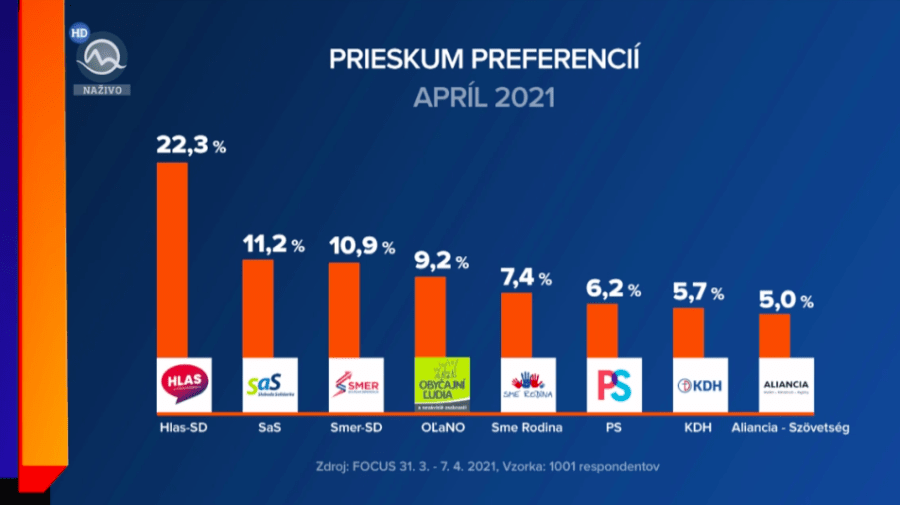 Pellegriniho Hlas by získal 22,3 % hlasov, SaS je novým lídrom koalície so ziskom 11,2 %. Na treťom mieste sa umiestnil Smer s 10,9 % hlasov a nasleduje hnutie OĽANO s 9,2 %, čo je v porovnaní so ziskom vo voľbách extrémny prepad.