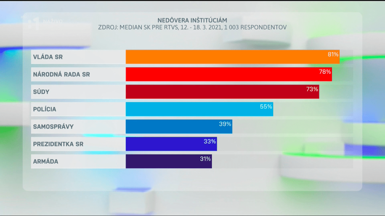 Prieskum tiež ukázal, že najdôveryhodnejšou inštitúciou je úrad prezidentky SR. Naopak, ľudia najmenej dôverujú vláde.