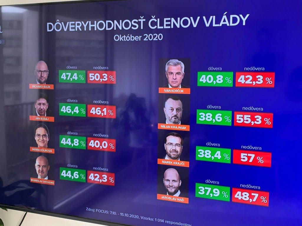 Šéfovi rezortu školstva Branislavovi Gröhlingovi verí 44,6 percenta a šéfovi rezortu diplomacie Ivanovi Korčokovi 40,8 percenta respondentov. Ministrovi práce, sociálnych vecí a rodiny Milanovi Krajniakovi (Sme rodina) vyslovilo dôveru 38,6 percenta opýtaných, ministrovi zdravotníctva za Marekovi Krajčímu (OĽaNO) 38,4 percenta a šéfovi rezortu obrany Jaroslavovi Naďovi (OĽaNO) 37,9 percenta.