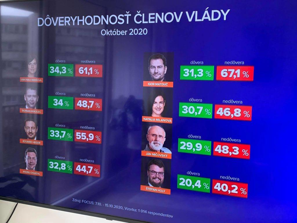 Na prvom mieste v rebríčku nedôvery sa ocitol predseda vlády Igor Matovič. Nedôveruje mu až 67,1% opýtaných. Iba 31,3% odpovedalo, že premiérovi dôveruje.